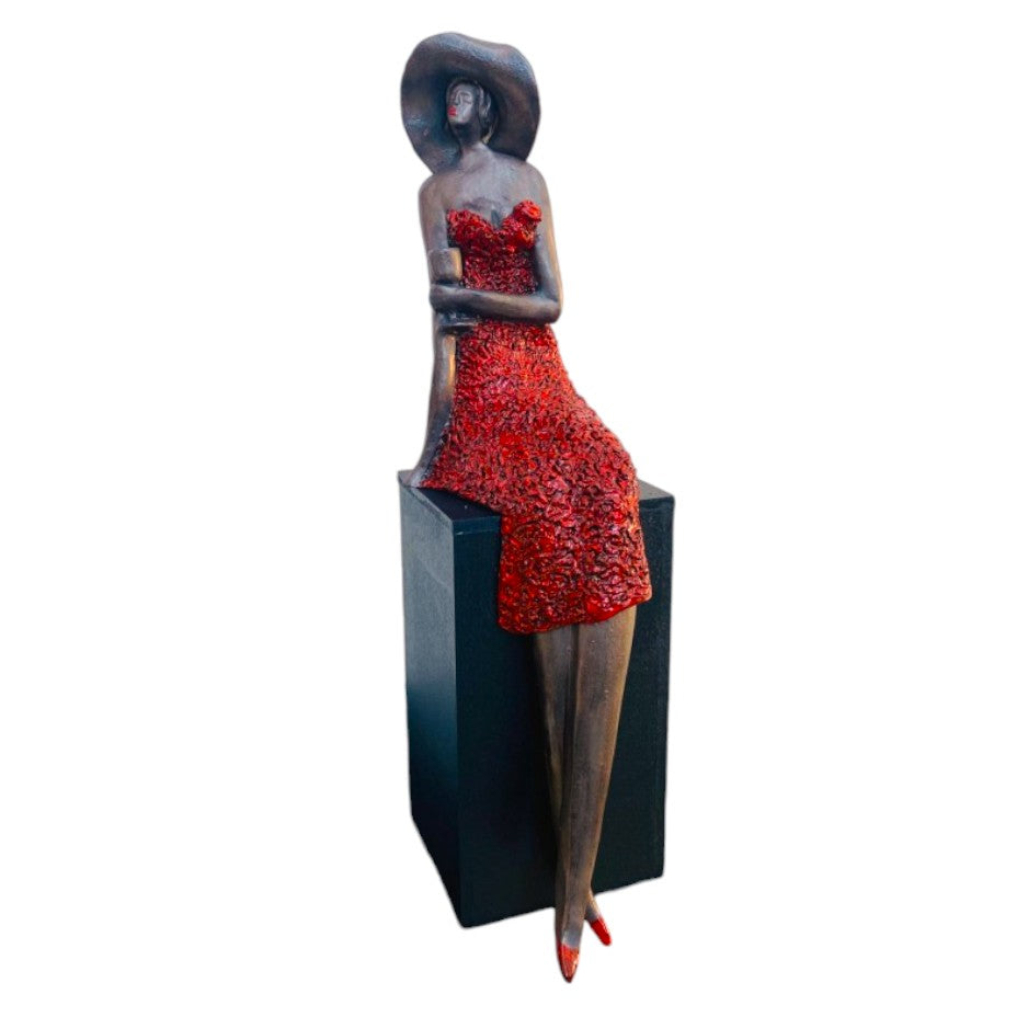 Aan het genieten incl. houten zuiltje - Zittende vrouw van Keramiek Rood - Bernadette te Wierik