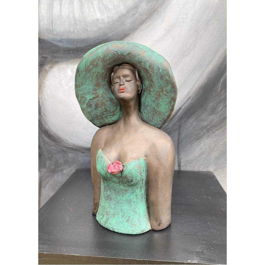 Borstbeeldje met houten sokkel - Vrouwenfiguur - Brons Groen - Bernadette te Wierik