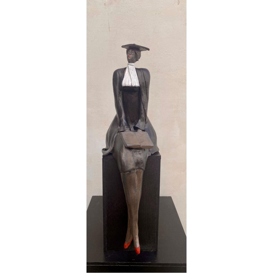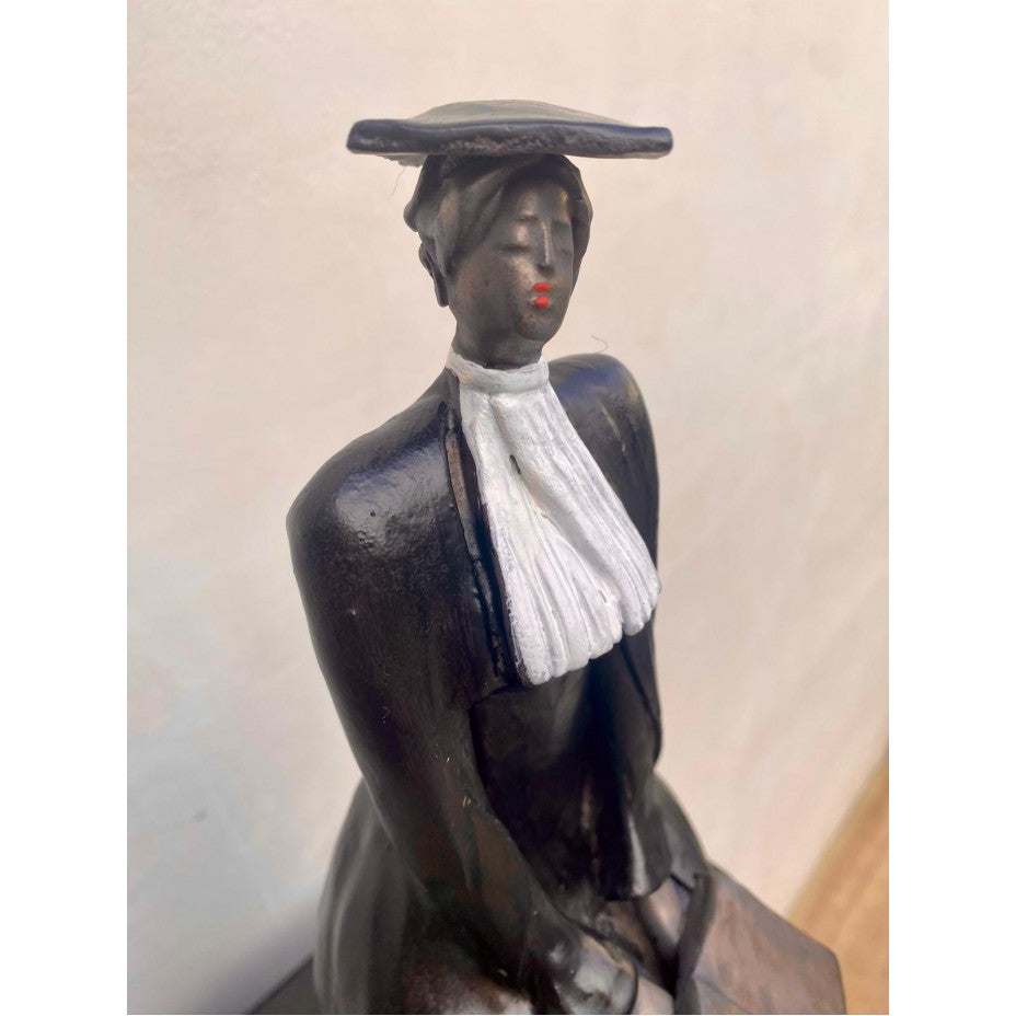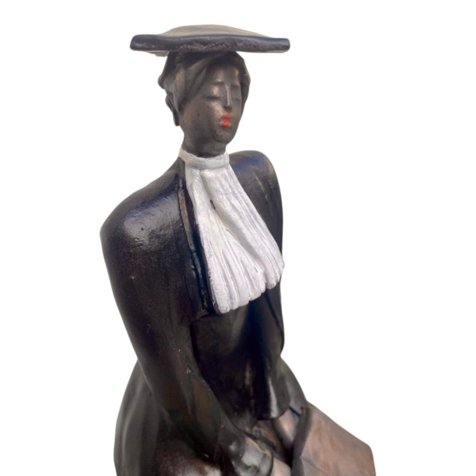 Keramisch beeld “Advocaat 3” – zittende vrouw – inclusief houten sokkel – ideaal relatiegeschenk/afscheid – 38x12x9 cm