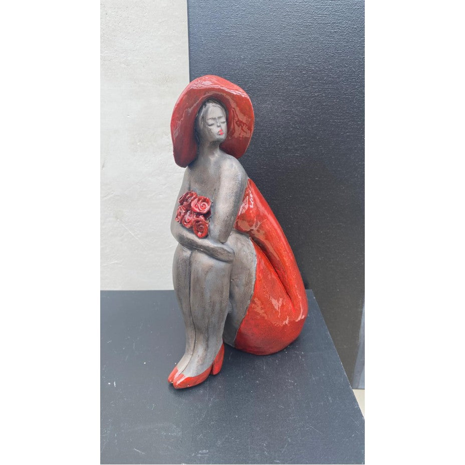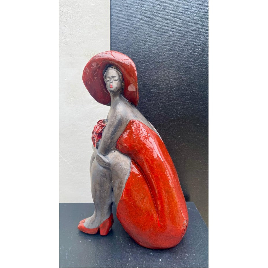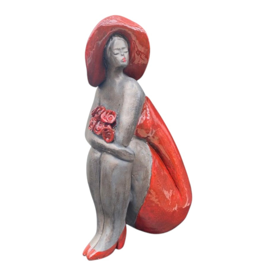 Keramisch beeld “Attractive Woman” – zittende vrouw met hoed – handgemaakt kunstcadeau – 23x15x9 cm