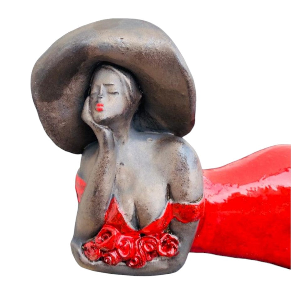 Keramisch Beeld ‘Charmante Vrouw’ – Liggende Vrouw – Handgemaakt Rood Kunstbeeld