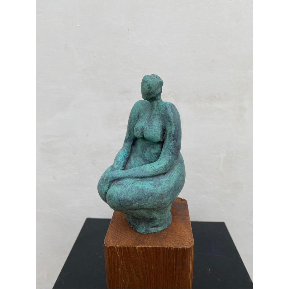 Keramisch Beeld ‘Denker’ – Groen Keramiek op Zuil – Handgemaakt Kunstbeeld – 15×8×9 cm
