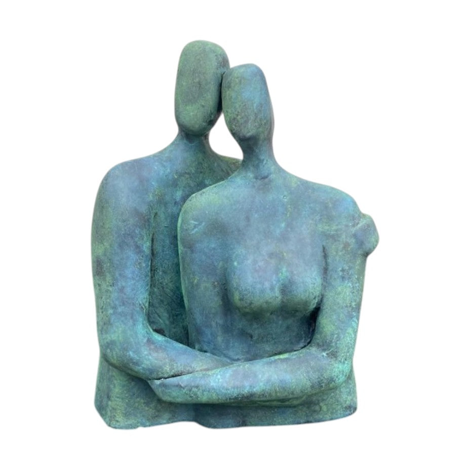 Keramisch beeld “Looking into the Past” – handgemaakt brons‑groen – 17x7x13 cm kunstwerk
