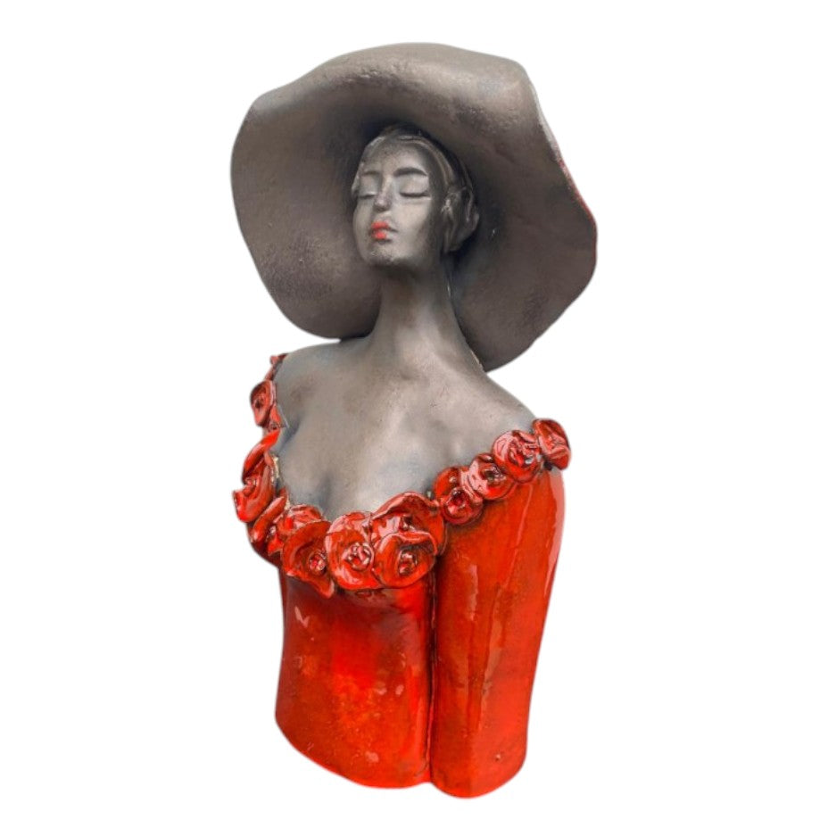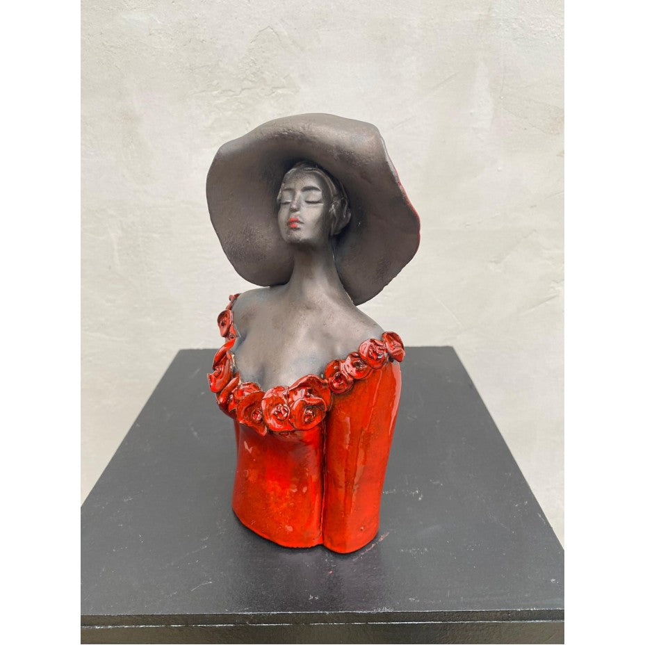 Keramisch borstbeeld “Attraction” – rood – vrouw met hoed – handgemaakt kunstcadeau – 20x10x6 cm
