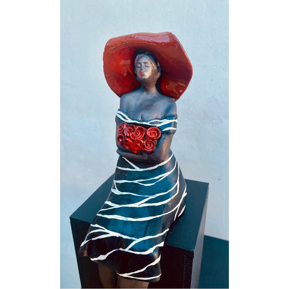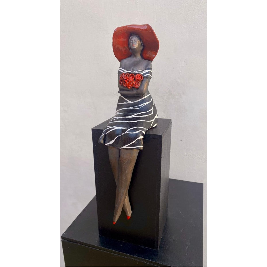 Keramisch zittend Beeld - Vrouw met Rozen "Aanzien" incl. houten zuil - Keramiek - 30 cm